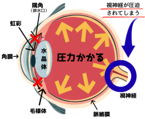 目の中には水が流れています。しかし、目の外へ出ていく出口が詰まると目の中に強い圧力がかかってしまいます。